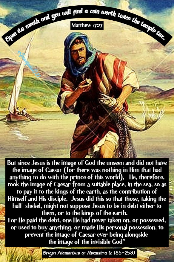 But since Jesus is the image of God the unseen and did not have the image of Caesar (for there was nothing in Him that had anything to do with the prince of this world), He, therefore, took the image of Caesar from a suitable place, in the sea, so as to pay it to the kings of the earth, as the contribution of Himself and His disciple. Jesus did this so that those, taking the half-shekel, might not suppose Jesus to be in debt either to them, or to the kings of the earth. For He paid the debt, one He had never taken on, or possessed, or used to buy anything, or made His personal possession, to prevent the image of Caesar ever being alongside the image of the invisible God” – Origen Adamantius of Alexandria (c 185-253) Priest, Theologian, Exegist, Writer, Apologist, Father – Commentary on Matthew.