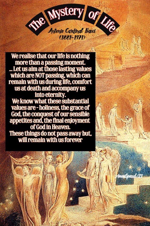Let us aim at those lasting values which are NOT passing, which can remain with us during life, comfort us at death and accompany us into eternity. We know what these substantial values are – holiness, the grace of God, the conquest of our sensible appetites and, the final enjoyment of God in Heaven. These things do not pass away but, will remain with us forever!”