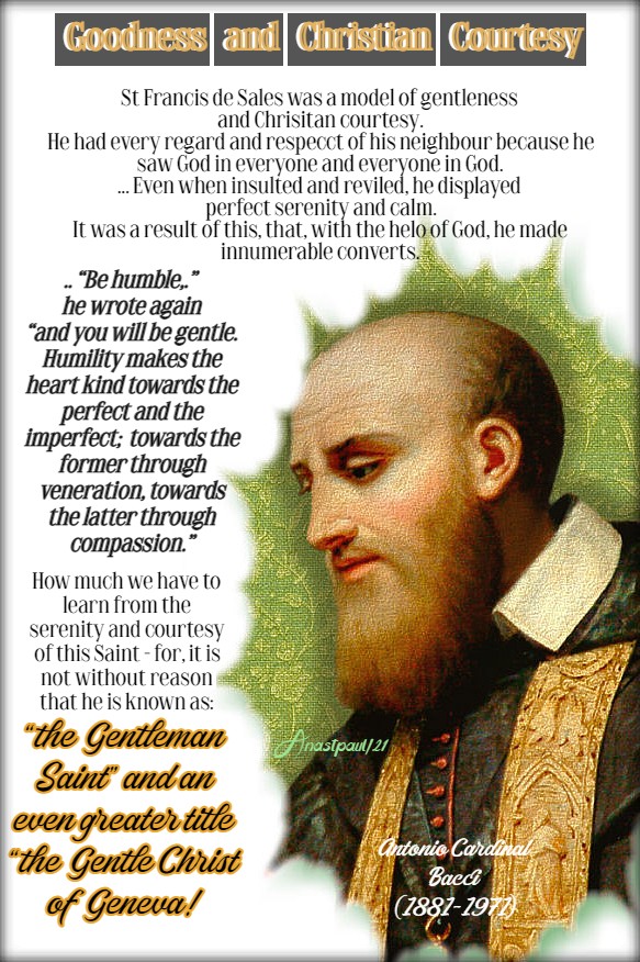 “St Francis de Sales was a model of gentleness and Chrisitan courtesy. He had every regard and respecct of his neighbour because he saw God in everyone and everyone in God.