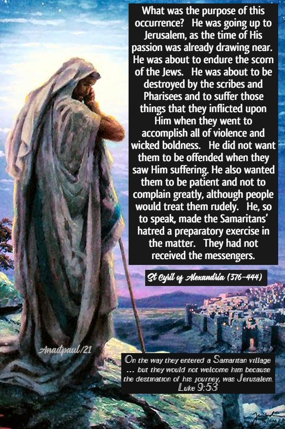 REFLECTION – “It says, “When the days drew near for him to be received up, he set his face to go to Jerusalem.” This means, that after He would endure His saving Passion for us, the time would come when He should ascend to heaven and dwell with God the Father, so He determined to go to Jerusalem. This is, I think, the meaning of his “set his face.”