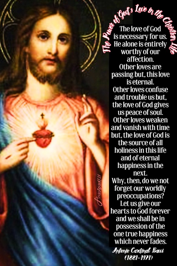 “Everyday, in the lives of the Saints, was a continual act of love of God. This was how they became holy. They loved God intensely all the time. They loved Him above all things. Everything which they thought, desired or did, was directed to Him. Their entire lives were consecrated to Him. We should all desire to be holy, if we do, we must love God with our whole heart, strength and will. Not until then, will every action of ours become meritorious. Holiness is born of the love of God. Without the love of God, everything is futile and useless; our conversation is so much idle chatter; our desires are empty dreams which excite us for a while and then dissolve like bubbles of soap; our actions are unprofitable and our enterprises are not aimed at a true objective; our achievements can inflate us for a time but they will leave us disillusioned at the hour of death. The love of God is necessary for us. He alone is entirely worthy of our affection. Other loves are passing but, this love is eternal. Other loves confuse and trouble us but, the love of God gives us peace of soul. Other loves weaken and vanish with time but, the love of God is the source of all holiness in this life and of eternal happiness in the next. Why, then, do we not forget our worldly preoccupations? Let us give our hearts to God forever and we shall be in possession of the one true happiness which never fades.”