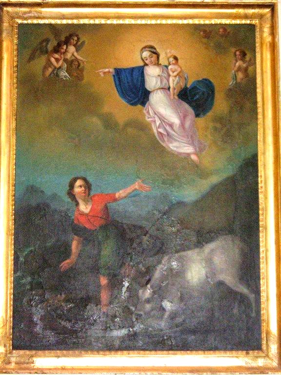 in 1144, a boy found his calf kneeling before an unusual iron Cross, apparently just unearthed. The Madonna appeared, asking for the young herder to spread the news and for a Church to be built on the spot, half a mile high in the mountains.
