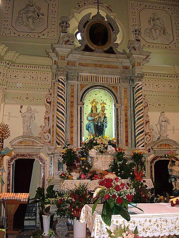In 1560, a chest was found floating in the sea. It was taken ashore and found to contain a stone Statue of the Madonna. When the chest was placed in a cart, the oxen suddenly took off for the mountain pass and nothing more was heard of the Statue until it turned up in the heart of Aspromonte, at the place where a calf had found a Cross and the Madonna had requested a Church. The Sanctuary there became a place of pilgrimage.