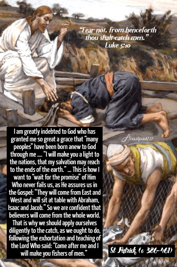 That is why we should apply ourselves diligently to the catch, as we ought to do, following the exhortation and teaching of the Lord Who said: “Come after me and I will make you fishers of men.” And again, He said through the prophets: “Look! I will send many fishermen and hunters.” That is why it was so important to cast our nets, so that “a great number [of fish],” “a crowd” of people might be caught for God and, that everywhere, there might be Priests according to the word of the Lord: “Go, therefore and make disciples of all nations, baptising them in the name of the Father and of the Son and of the Holy Spirit, teaching them to observe all that I have commanded you. And, behold, I am with you always, until the end of the age.” – St Patrick (c 386-461) Bishop – Confession, 38-40 (SC 249)