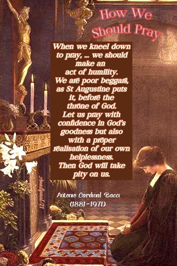 When we kneel down to pray, therefore, we should make an act of humility. We are poor beggars, as St Augustine puts it, before the throne of God. Let us pray with confidence in God’s goodness but also with a proper realisation of our own helplessness. Then God will take pity on us.