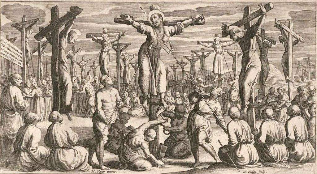 Fr Tsuji had been living with a devout Christian, Louis Maki and his son John. On the morning of 21 July 1626, just after he had celebrated Mass, which the Makis attended, the house was invaded by soldiers and the three were arrested. Fr Tsuji appeared before the district judge and when asked who he was and what he was doing, he responded: “For many years the people of Nagasaki have seen Thomas Tsuji, a religious of the Society of Jesus and have heard him preach the Christian message. I am he and I am prepared to uphold. with my life and to testify with my blood. to the truths that I have faithfully taught.” He was found guilty and imprisoned at the Omura prison. The Makis were also imprisoned for collaborating with a Priest and offering him hospitality.