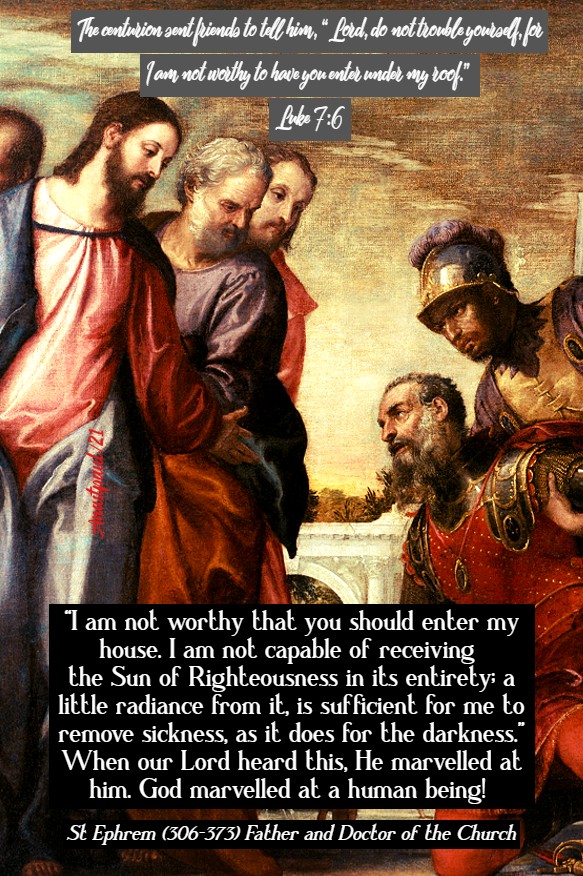 REFLECTION – “I am not worthy that you should enter my house. I am not capable of receiving the Sun of Righteousness in its entirety; a little radiance from it, is sufficient for me to remove sickness, as it does for the darkness.” When our Lord heard this, He marvelled at him. God marvelled at a human being! He said to those who were near Him, “Truly, I say to you, not even in anyone among the house of Israel have I found this kind of faith.” The Centurion had brought them and he came, so that they would be advocates on his behalf. He rebuked them because they did not possess his faith. To show that the Centurion’s faith was the first of the faith of the Gentiles, He said, “Do not imagine that this faith can be limited to the cCnturion.” For he saw and believed. “Many will believe who have not seen.” “Many will come from the east and from the west and will sit at table with Abraham, Isaac and Jacob in the kingdom of heaven” – St Ephrem (306-373) Deacon, Father and Doctor of the Church – (Commentary on Tatian’s Diatessaron, 6.)