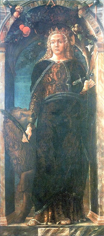 The Roman Martyrology states of her today: “At Chalcedon, the birthday of St Euphemia, Virgin and Martyr, under the Emperor Diocletian and the Proconsul Priscus. For faith in Our Lord, she was subjected to tortues, imprisonment, blows, the torment of the wheel, fire, the crushing weight of stones, the teeth of beasts, scourging with rods, the cutting of sharp saws, burning pans, all of which she survived. But when she was again exposed to the beasts in the amphitheatre, praying to Our Lord to receive her spirit, one of the animals, having inflicted a bite on her sacred body, whilst the rest licked her feet, she yielded her unspotted soul to God.”
