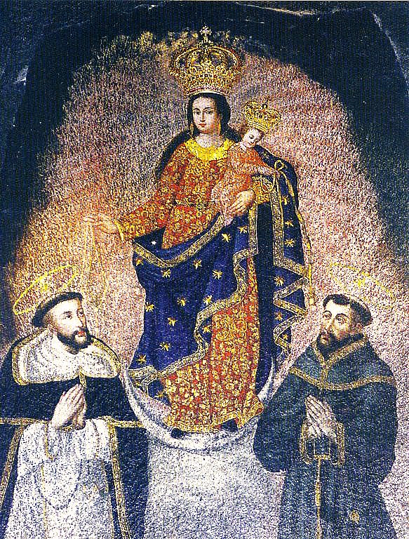 In 1754, Maria Mueses de Quinones, an Indian woman from the village of Potosi, Colombia and her deaf-mute daughter, Rosa, were caught in a very strong storm. They sought refuge in a cave in the gigantic Lajas mountains. To Maria’s surprise, her mute daughter, Rosa exclaimed with her first words “the mestiza is calling me…” Maria did not see the figures of a woman and child that the girl described and fearfully ran back with her daughter to Ipiales and told the townspeople. After later returning to the spot, the woman saw an apparition of Our Lady and Child. Some months later, Rosa died and was returned to life when her mother prayed again at the cave. The townspeople came to see this place and encountered the miraculous image burned into the rocks!