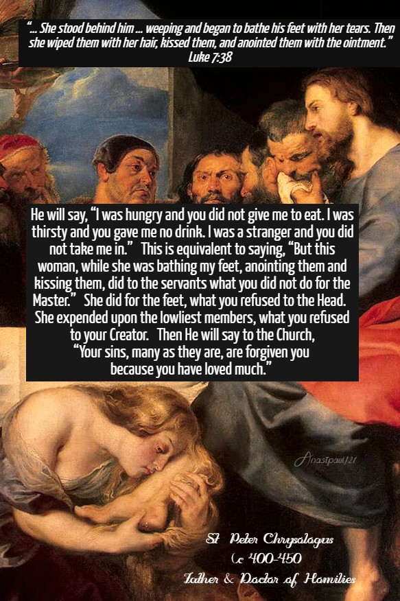 When will He speak these words? He will speak them when He will come in the majesty of His Father and separate the righteous from the unrighteous, like a shepherd who separates the sheep from the goats. He will say, “I was hungry and you did not give me to eat. I was thirsty and you gave me no drink. I was a stranger and you did not take me in.” This is equivalent to saying, “But this woman, while she was bathing my feet, anointing them and kissing them, did to the servants what you did not do for the Master.” She did for the feet, what you refused to the Head. She expended upon the lowliest members, what you refused to your Creator. Then He will say to the Church, “Your sins, many as they are, are forgiven you because you have loved much.” – St Peter Chrysologus (c 400-450) Bishop of Ravenna, Father and “Doctor of Homilies”of the Church (Sermon 95)