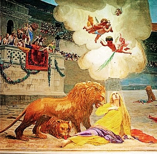 The governor of Chalcedon, Priscus, had published a decree that all of the inhabitants of the City take part in sacrifices to the deity Ares. Euphemia was discovered, with forty-nine other Christians, hiding in a house and worshipping God, in defiance of the governor’s orders. Because of their refusal to sacrifice, they were tortured for a number of days,and then, all but Euphemia, were sent to the Emperor for trial. Euphemia, the youngest among them, was separated from her companions and subjected to particularly harsh torments, including the wheel, in hopes of breaking her spirit. She was placed in the arena, where lions were sent out to kill her,but they instead licked her wounds. She eventually died of wounds from a wild bear in the arena.
