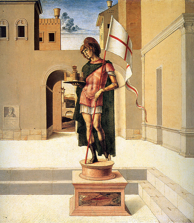 Terence’s most famous figuration in art is his minor appearance—as a young soldier Saint—in a predella panel of Giovanni Bellini’s “Pesaro Altarpiece, The Coronation of the Virgin” (ca. 1475–80). In it, Terence, as the City’s Patron, holds a model representing the Nuova Rocca, or Fortezza Costanzo, the Citadel of Pesaro newly rebuilt by Costanzo Sforza. The Altarpiece is below – St Terence is bottom right of the bottom panel – see amplified image above.