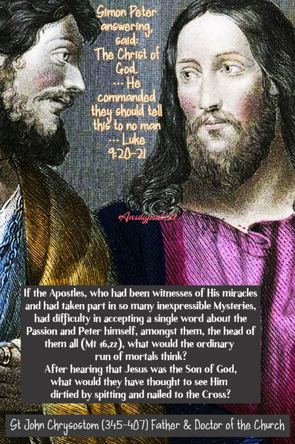 Because, it was one thing to be seeing Him now, multiplying miracles in Palestine and then, as the butt of persecution and torture – and the Cross was going to follow these miracles. It was another thing to see Him worshiped, believed in by all the world, saved from the ill-treatment He had undergone before. That is why He suggests they say nothing to anyone… If the Apostles, who had been witnesses of His miracles and had taken part in so many inexpressible Mysteries, had difficulty in accepting a single word about the Passion and Peter himself, amongst them, the head of them all (Mt 16,22), what would the ordinary run of mortals think? After hearing that Jesus was the Son of God, what would they have thought to see Him dirtied by spitting and nailed to the Cross? And this, too, before the coming of the Holy Spirit, when the reason for these Mysteries was not yet known?” – St John Chrysostom (345-407) Bishop of Constantinople, Father & Doctor of the Church (Homilies on Saint Matthew’s Gospel, no.54, 1-3)