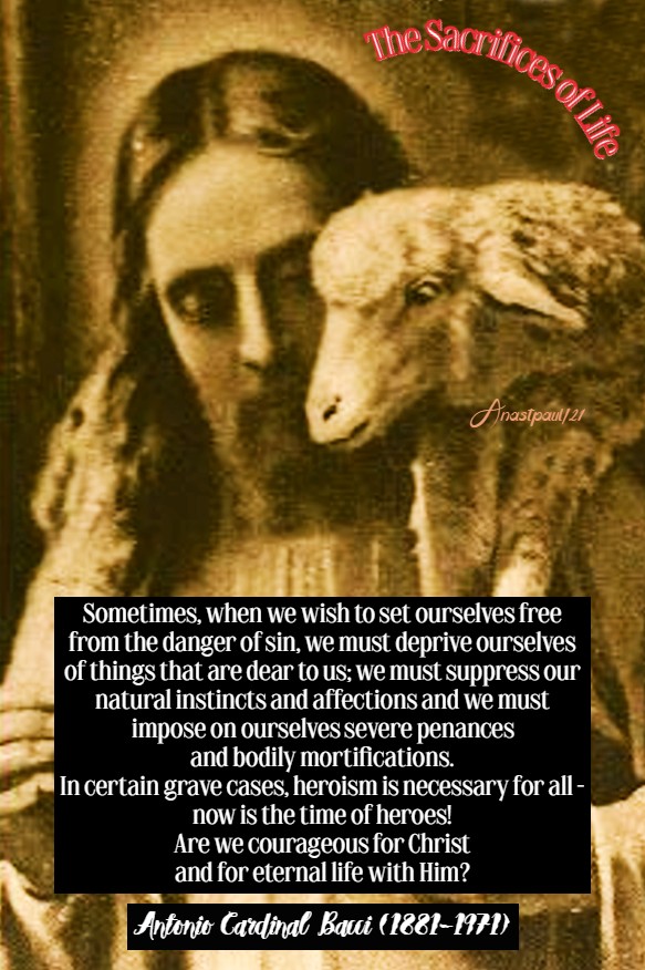 Sometimes, when we wish to set ourselves free from the danger of sin, we must deprive ourselves of things that are dear to us; we must suppress our natural instincts and affections and we must impose on ourselves severe penances and bodily mortifications. All this is demanded from us by Jesus in these words which seem hard and almost cruel but are none other than a just and necessary commandment. In certain grave cases, heroism is necessary for all – now is the time of heroes! Are we courageous for Christ and for eternal life with Him?”