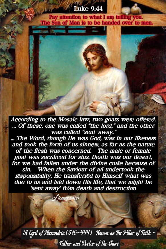 REFLECTION – “The mystery of the Passion may be seen also in another instance. According to the Mosaic law, two goats were offered. They were not different in any way from one another but they were alike in size and appearance. Of these, one was called “the lord,” and the other was called “sent-away.” When the lot was cast for the one called “lord,” it was sacrificed. The other one, was sent away from the sacrifice, and, therefore, had the name of “sent-away.” Who was signified by this? The Word, though He was God, was in our likeness and took the form of us sinners, as far as the nature of the flesh was concerned. The male or female goat was sacrificed for sins. Death was our desert, for we had fallen under the divine curse because of sin. When the Saviour of all undertook the responsibility, He transferred to Himself what was due to us and laid down His life, that we might be ‘sent away‘ from death and destruction.” – St Cyril of Alexandria (376-444) Known as The Pillar of Faith – Father and Doctor of the Church (Commentary on Luke, Homily 53)