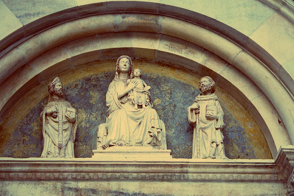 Lunette of the Portal of the Church of the Abbey of Viboldone, Milan, Italy. On the left is Saint Ambrose (Patron Saint of Milan), with Our Lady with the Child Jesus in the centre and St John of Meda on the right.