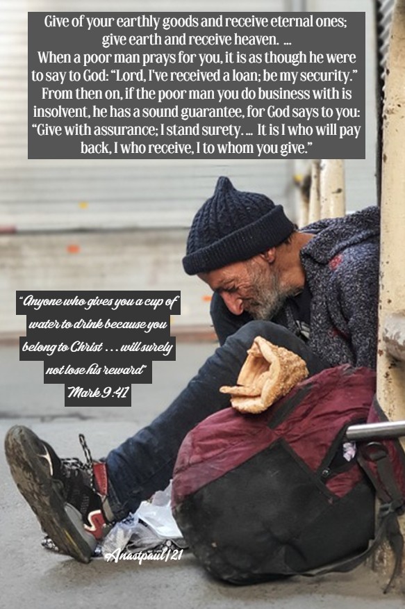 REFLECTION – “Give of your earthly goods and receive eternal ones; give earth and receive heaven. But give to whom? … Hear Scripture telling you how you are to lend to the Lord Himself: “He who has compassion on the poor lends to the Lord” (Prv 19:17). God most certainly is in no need of you but another is in need; what you give to the one is received by another. For the poor has nothing with which to pay you back; he would like to but cannot find anything. The only thing he has is a kindly wish to pray for you. But when a poor man prays for you, it is as though he were to say to God: “Lord, I’ve received a loan; be my security.” From then on, if the poor man you do business with is insolvent, he has a sound guarantee, for God says to you: “Give with assurance; I stand surety. … It is I who will pay back, I who receive, I to whom you give.”