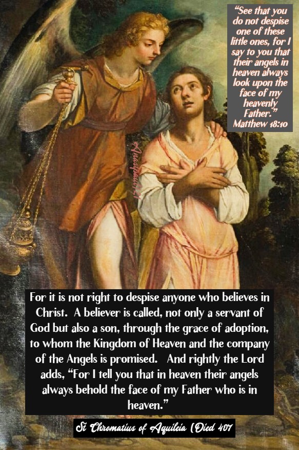 How much grace the Lord has toward each one believing in Him, He Himself declares when He shows their Angels always beholding the face of the Father who is in Heaven. Great is the grace of the Angels toward all who believe in Christ. Finally, the Angels carry their prayers to heaven. Hence the word of Raphael to Tobias: “When you prayed along with your daughter-in-law Sara, I offered the memory of your prayer in the sight of God.” Around them there is also the strong guard of the Angels; they help each of us to be free from the traps of the enemy. For a human in his weakness could not be safe amid so many forceful attacks of that enemy, if he were not strengthened by the help of the Angels.” – St Chromatius of Aquileia (Died 407) Bishop of Aquileia, Contemporary of St Jerome, St John Chrysostom (Tractate on Matthew, 57)