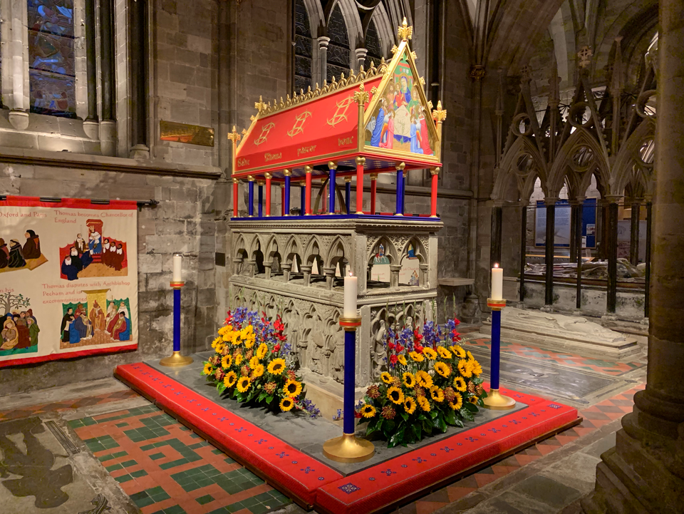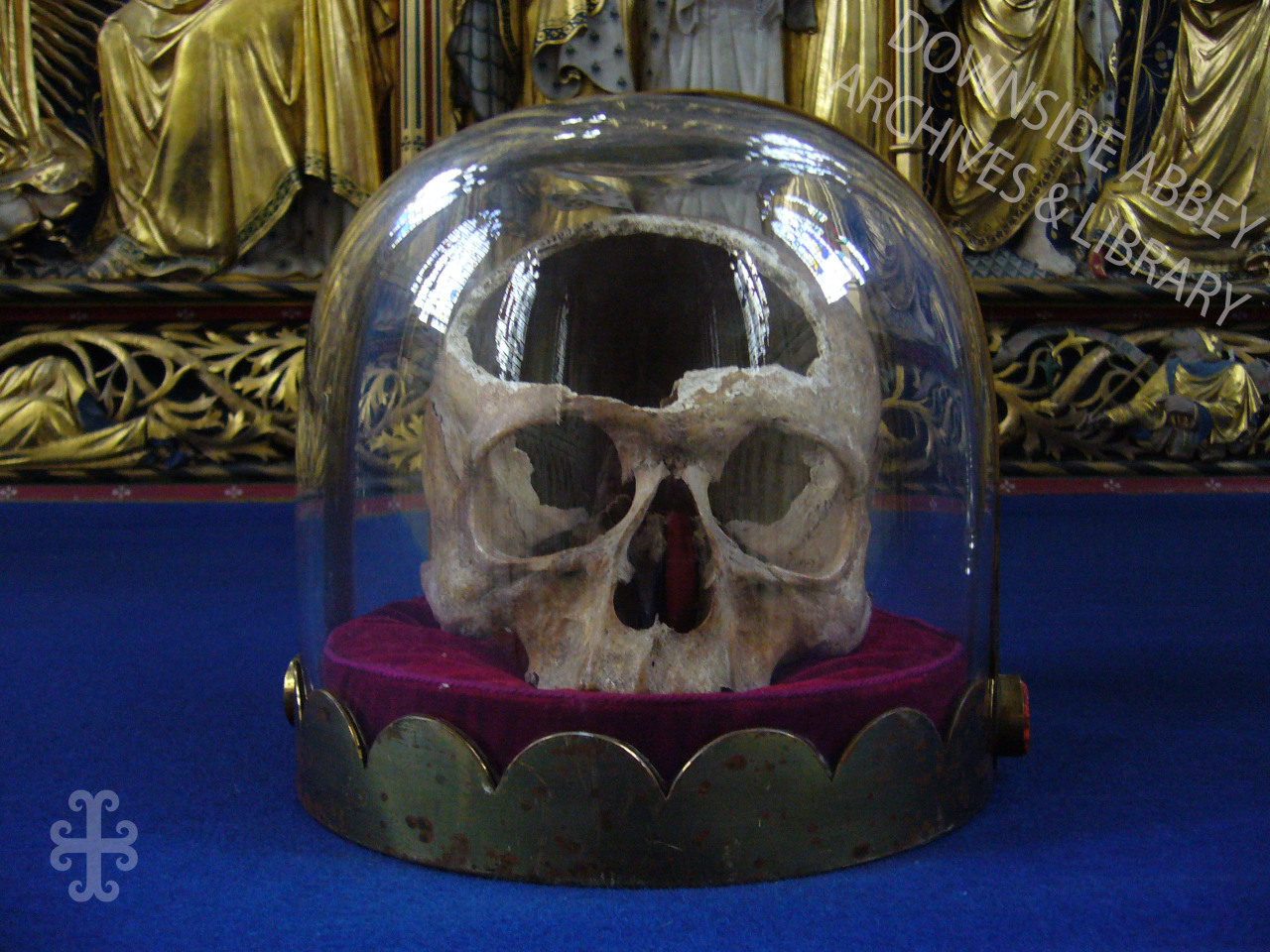 At the Reformation all the Shrines in Hereford Cathedral were swept away. St Thomas’ Shrine was wholly demolished but the faithful managed to rescue some of his relics, including his head. These bones were preserved until the seventeenth century by local Catholics but were dispersed thereafter, some of St Thomas’ relics are still honoured in England at Belmont Abbey in Herefordshire, Stonyhurst College in Lancashire and since 1881, St Thomas’ skull has be preserved at Downside Abbey.
