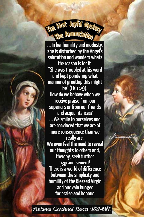 How do we behave when we receive praise from our superiors or from our friends and acquaintances? We are pleased and overcome perhaps by feelings of vanity. We smile to ourselves and are convinced that we are of more consequence than we really are. We even feel the need to reveal our thoughts to others and, thereby, seek further aggrandisement! There is a world of difference between the simplicity and humility of the Blessed Virgin and our vain hunger for praise and honour.”