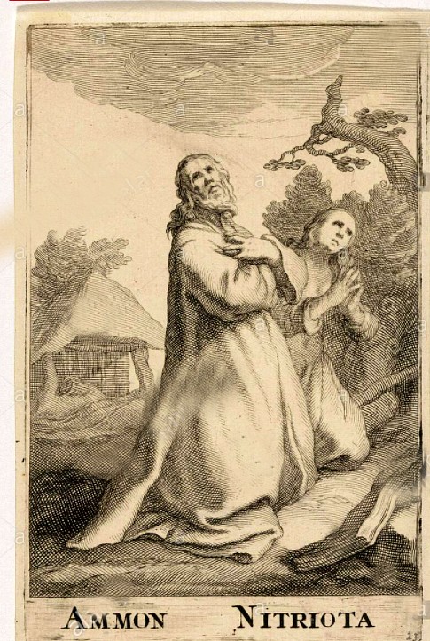 Pushed into marriage by his family at the age of 20, he managed to persuade his bride to take a vow of chastity together with him by the authority of St. Paul’s Epistle to the Corinthians. They lived together this way for 18 years, when at her wish, they parted, and he retired to Scetis and Mount Nitria, to the south of Lake Mareotis, where he lived for 22 years, visiting his sister-wife twice a year. She had founded a convent in her own house.