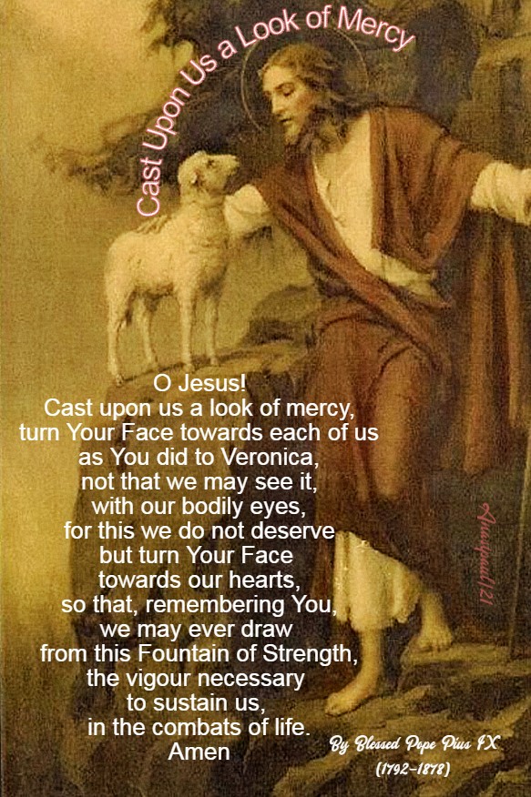 O Jesus! Cast upon us a look of mercy, turn Your Face towards each of us as You did to Veronica, not that we may see it, with our bodily eyes, for this we do not deserve but turn Your Face towards our hearts, so that, remembering You, we may ever draw from this Fountain of Strength, the vigour necessary to sustain us, in the combats of life. Amen