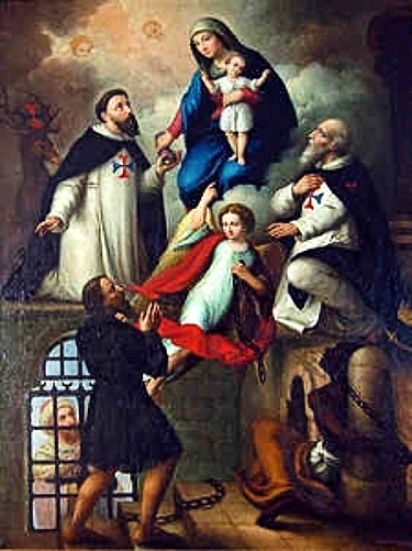 In 1197, a Sorbonne Doctor of Theology and newly Ordained Priest, Jean de Matha, while saying his first Holy Mass, saw a vision of an Angel with a red and blue cross on his chest and his hands resting on the heads of two captives. The following year, St Jean founded a religious order dedicated to the redemption of Christians held as slaves by Moslems — the Hospitaler Order of the Most Holy Trinity and of Captives, commonly called the Trinitarians. On their habit, Jean placed the Cross he had seen on the Angel,and, as their Patron, he gave them Notre-Dame du Bon Remède, a popular devotion in his Provençal homeland. Now devoted largely to education and evangelisation, for three centuries they raised funds and travelled from Europe into Africa to buy thousands of captives’ freedom with Our Lady’s help. A painting (right) in the Trinitarian Motherhouse of Cerfroid in northern France, shows Our Lady of Good Remedy giving a bag of money to St Jean/John of Matha, while a grateful freedman and St Felix of Valois, look on. The Order celebrates her feast day 8 October.