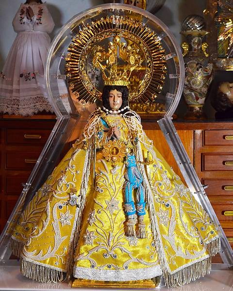 The image is made of paste – pieces of cornstalk, smoothed and cemented together with glue. It is little more than 30 centimetres in height and represents the Virgin Mary under her title of the Immaculate Conception. The hands, joined before the breast, are of wood. The original sculpture donated by Fray Antonio de Segovia consisted only of the upper half, it is believed, the lower section having been added at a later date. As the lower half is not in proportion to the upper, the reconstruction gives a stunted effect to the image. However, nowadays the Statue is always covered with rich vestments of fabric, the disproportion is not apparent.