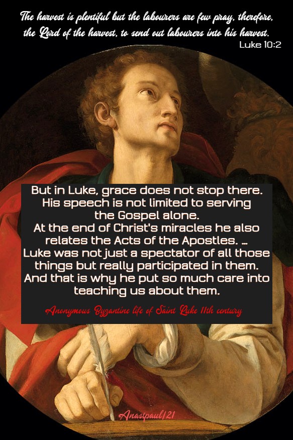 But in Luke, grace does not stop there. His speech is not limited to serving the Gospel alone. At the end of Christ’s miracles he also relates the Acts of the Apostles. … Luke was not just a spectator of all those things but really participated in them. And that is why he put so much care into teaching us about them.” – Anonymous Byzantine life of Saint Luke – 11th century (Saint Luke, Evangelist and companion of Paul – 6-7; PG 115, 1134-1135).