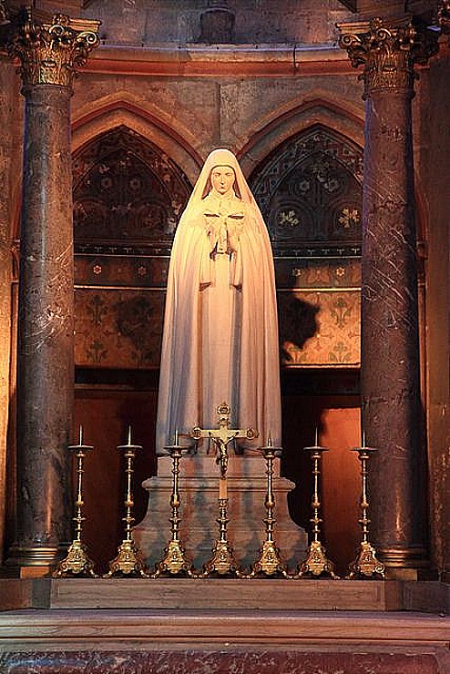This Church, having fallen to ruins, was later rebuilt by Ebo and Hincmar. It was finished in the year 845 and still remains a place of pilgrimage to the Mother of God. At one time enemies of the Cathedral chapter set fire to a monastery of Rheims. Among the relics which the sacristan tried to save was an ivory statue of the Virgin, containing some of her hair. The sacristan prayed fervently to the Virgin that she would preserve this relic. The Abbot, entering the ruins of the Church, found the Statue upright and unharmed as if placed there reverently. From thence forward, the image was believed to be miraculous. The present Cathedral takes the place of the older churches, the previous one having been damaged by fire in 1210. It was not completed until the 14th century, and is the beautiful Gothic Cathedral that can still be seen today, after much restoration work after the bombardments of WWI and II.