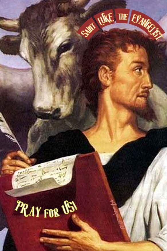 PRAYER – O Lord, we beseech Thee, that Luke, Thy holy Evangelist, who for the honour of Thy Name bore continuously in his body the suffering of the Cross, may intercede on our behalf. Through the same Jesus Christ, Thy Son our Lord, Who lives and reigns with Thee, in the unity of the Holy Ghost, God, world without end. Amen (Collect).