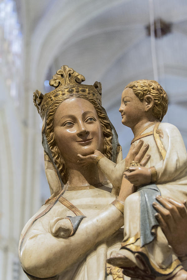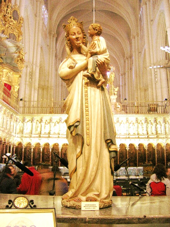 In 1225 a new Cathedral was begun to replace the older one, for which King Fernando III drew up the plans and laid the cornerstone. Fernando’s good friend, the Archbishop Rodrigo Ximenez de Rada, worked very enthusiastically for the completion of the new Cathedral where he was Bishop. There are so many masterpieces of art and beautiful Shrines in the City of Toledo, Spain, that a visitor may easily miss the White Virgin. She stands atop an Altar in the choir of Toledo’s magnificent Cathedral. It is said that you can live to be 100 years old, visit this wonderful Cathedral once a week for all of your life and still never finish discovering its glories!