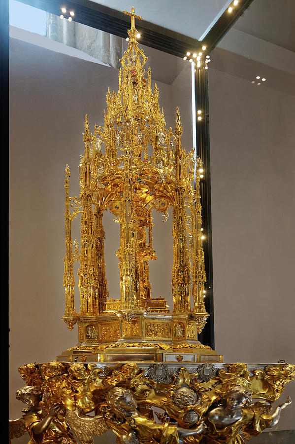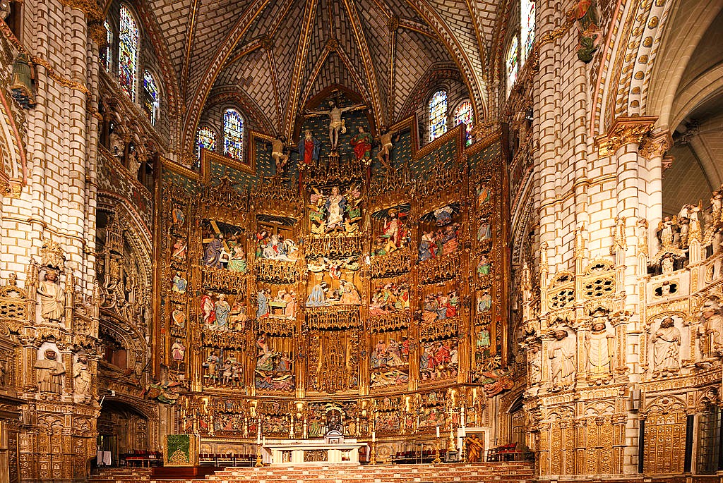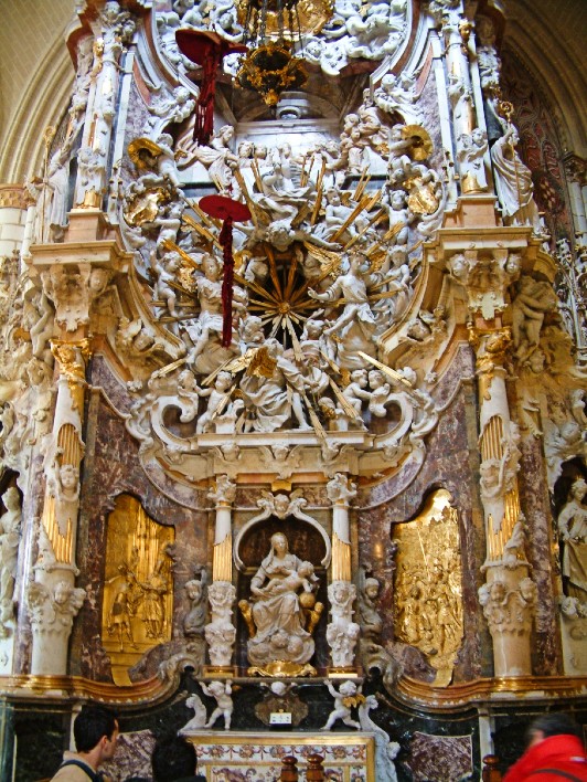 The sacred image of Our Lady is a polychromed alabaster Statue of French origin from the twelfth century. Both Mother and Child are clothed in white, their garments bordered with jeweled gold. Their faces darkened by time, are framed with curly, strawberry-blond hair. The Statue has also been called the “Smiling Virgin of Toledo;” for the Child’s right hand caresses His Mother’s face, tickling her chin. She responds with a smile that gives this image its popular name. It is also called the “Virgin of Prima” and the “Virgen Blanca.” There is also another artifact worthy of special mention and that is the ten foot tall great Monstrance of Arfe. It is made of both silver and gold, inset with precious gems. It took nearly 8 years to construct and is done in a Gothic style that is truly a magnificent work of art.