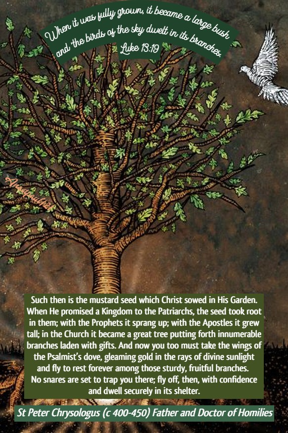 Christ is the Kingdom of Heaven. Sown like a mustard seed in the garden of the Virgin’s womb, He grew up into the Tree of the Cross, whose branches stretch across the world. Crushed in the mortar of the Passion, its fruit has produced seasoning enough for the flavouring and preservation of every living creature, with which it comes in contact. As long as a mustard seed remains intact, its properties lie dormant but when it is crushed, they are exceedingly evident. So it was with Christ, He chose to have His Body crushed because He would not have His Power concealed. Christ became all things in order to restore all of us in Himself. The Man Christ received the mustard seed, which represents the Kingdom of God; as Man He received it, though as God He had always possessed it. He sowed it in His Garden, that is in His Bride, the Church. The Church is a garden extending over the whole world, tilled by the plough of the Gospel, fenced in by stakes of doctrine and discipline, cleared of every harmful weed by the labour of the apostles, fragrant and lovely with perennial flowers, virgins’ lilies and martyrs’ roses set amid the pleasant verdure of all. who bear witness to Christ and the tender plants of all, who have faith in Him. Such then is the mustard seed which Christ sowed in His Garden. When He promised a Kingdom to the Patriarchs, the seed took root in them; with the Prophets it sprang up; with the Apostles it grew tall; in the Church it became a great tree putting forth innumerable branches laden with gifts. And now you too must take the wings of the Psalmist’s Dove, gleaming gold in the rays of divine sunlight and fly to rest forever among those sturdy, fruitful branches. No snares are set to trap you there; fly off, then, with confidence and dwell securely in its shelter.” – St Peter Chrysologus (c 400-450) Doctor of Homilies (Sermon 98.)
