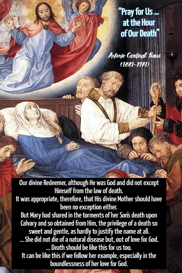 “Our divine Redeemer, although He was God and did not except Himself from the law of death. It was appropriate, therefore, that His divine Mother should have been no exception either. But Mary had shared in the torments of her Son’s death upon Calvary and so obtained from Him, the privilege of a death so sweet and gentle, as hardly to justify the name at all. Her soul was separated from her body as if in an ecstasy of love and was united even more indissolubly with God. She did not die of a natural disease but, out of love for God. She had always loved God with all the ardour of the noblest of creatures and her life ended in a final outpouring of love. It was the climax of a continuous ascent towards God.