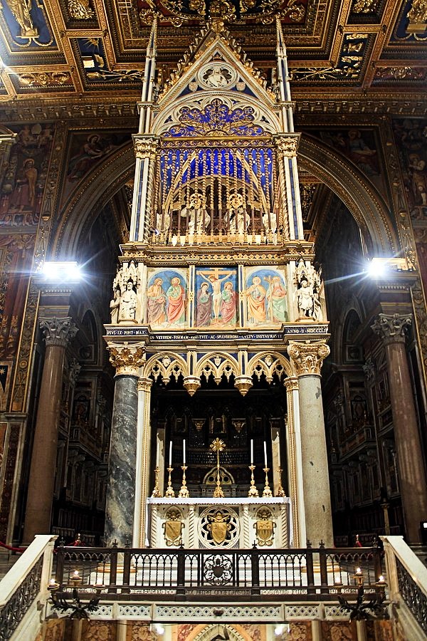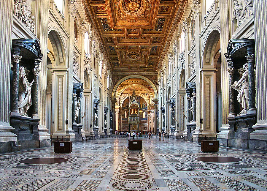 The original Church building, probably adapted from the hall of the palace, was dedicated to the Saviour and from its splendour was known as the Basilica Aurea. Though several times destroyed and rebuilt, the Basilica retained its ancient form, being divided by rows of columns into aisles and having an atrium with colonnades. The restoration of the 17th century changed its appearance. A Monastery was formerly between the Basilica and the City wall of which the cloister still remains. The original apse survived until 1878, when it was destroyed and a deeper apse built. The ancient mosaics have been preserved The high Altar, which is of wood and is believed to have been used by Saint Peter, is now encased in marble. In the upper part of the baldachinum are the heads of the Apostles, Peter and Paul. The Baptistery is an octagonal edifice with porphyry columns. The font is of green basalt. This Basilica has been the Cathedral of Rome since the 4th century.