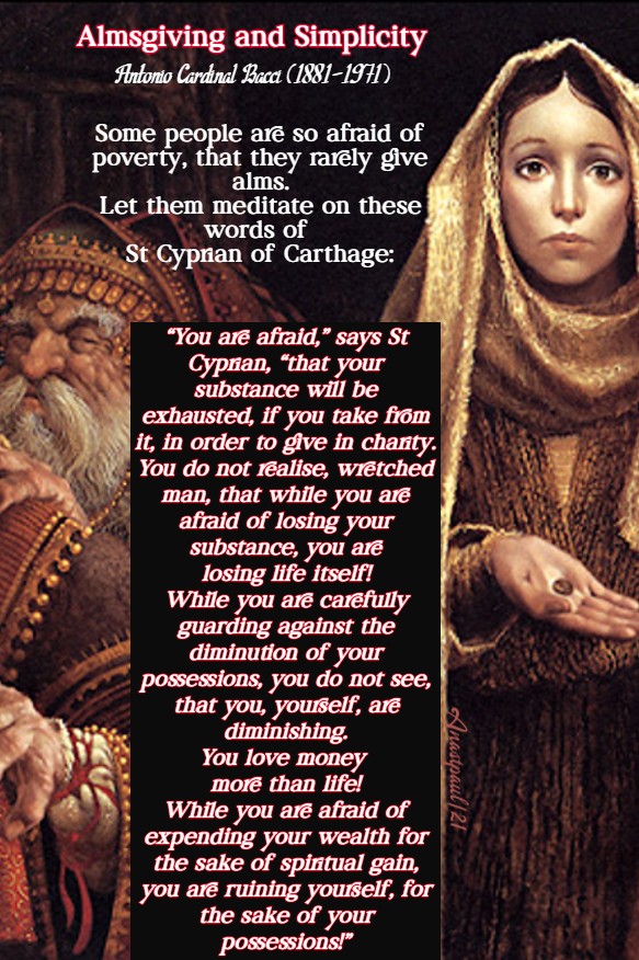 “You are afraid,” says St Cyprian, “that your substance will be exhausted, if you take from it, in order to give in charity. You do not realise, wretched man, that while you are afraid of losing your substance, you are losing life itself!