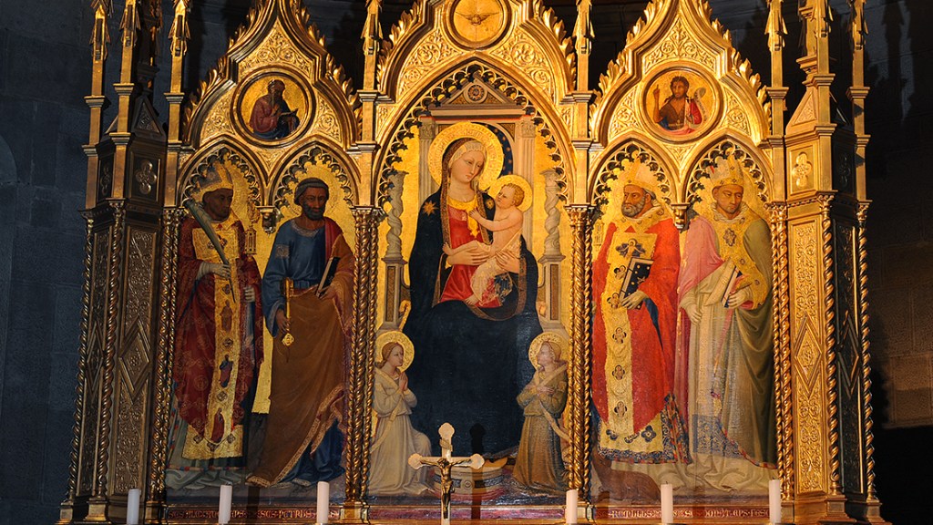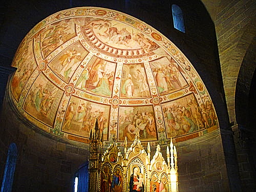 On the Feast of the Visitation in 1028 two young twin sisters, while they were guarding their flock, sought protection under a rock. The Virgin Mary holding the Infant Jesus in her arm, appeared to them in a cloud. She reassured them and told them that she desired a Church to be built there, then asks them to alert their father. He went to that place and the Virgin appeared to him and reiterates her request. The inhabitants of the village flocked to the site. Many of them also saw the Virgin. The ecclesiastical authorities approved the construction of a Sanctuary dedicated to Our Lady of Rock. The construction had just begun when Mary appeared to all present to thank them and encourage them to bring the work to completion. According to local legend, the Gospel was first preached at Fiesole (in the Province of Tuscany by Saint Romulus, a Disciple of Saint Peter during the days of the Christian persecutions. The Cathedral of Saint Romulus was built in 1028 by Bishop James Bavaro with materials taken from several other edifices – hence, the Shrine took the name Our Lady of the Rock. The little Church, now known as the Cathedral or Duomo of Saint Romulus, is in the Cathedral square – called the Shrine of the Primerana – is the one dedicated to Our Lady of the Rock. It was then enlarged in 1260, and again the following century. The bell tower dates from the year 1213. The Cathedral contains sculptures by Mino da Fiesole and the old Cathedral was once a Benedictine Abbey and had a large library, though that has long since been dispersed to other locations. The Abbey closed in 1778. Among other apparitions, too numerous to mention, is the one in which Mary warned Saint Andrew Corsini of his approaching death. During his lifetime, our Blessed Mother obtained from her Divine Son for Andrew the gifts of prophecy, miracles of healing, the conquest of hardened souls and many other conversions. The Cathedral of Fiesole is the resting place of a long list of Saints and illustrious churchmen, all of whom were devout clients of Our Lady.