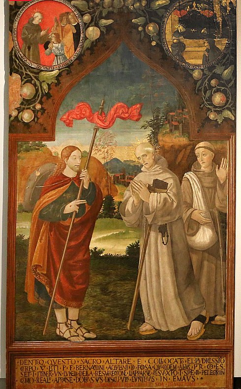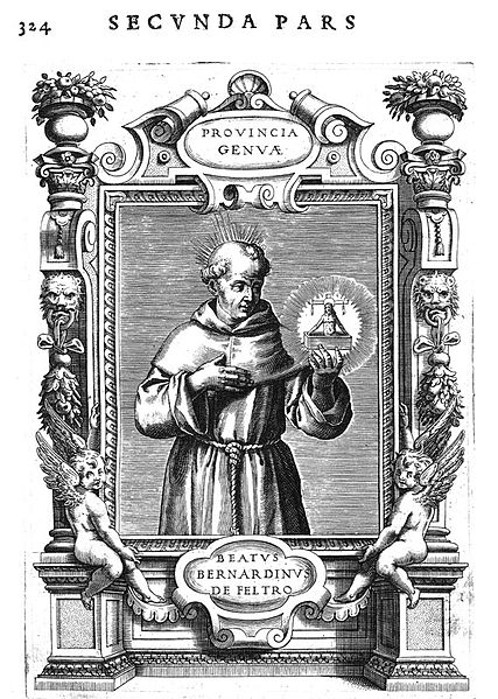 He was of very lively intelligence and excelled in his studies. He graduated in Canon and Civil Law in Perugia and in 1445, at 21, he entered the Friars Minor of the Observance and completed his novitiate at Gubbio. On 13 March 1446 he made his solemn profession in the Convent of Stroncone taking the name of Bernardine and receiving the Habit from St James of the Marches who was then preaching a course of Lenten sermons at Perugiato. As was the custom of many religious Orders at the time, the place of birth was added, so Giovanni became Fra ‘Bernardino da Fossa.