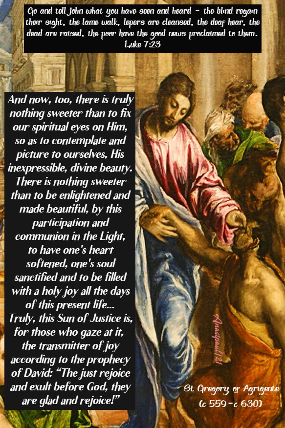 And now, too, there is truly nothing sweeter than to fix our spiritual eyes on Him, so as to contemplate and picture to ourselves, His inexpressible, divine beauty. There is nothing sweeter than to be enlightened and made beautiful, by this participation and communion in the Light, to have one’s heart softened, one’s soul sanctified and to be filled with a holy joy all the days of this present life… Truly, this Sun of Justice is, for those who gaze at it, the transmitter of joy according to the prophecy of David: “The just rejoice and exult before God, they are glad and rejoice!” And again: “Exult you just in the Lord, praise from the upright is fitting!” (Ps 68[67],4; 33[32],1).” – St Gregory of Agrigente (c 559-c 630) Bishop (Commentary on Ecclesiastes, 10, 2).