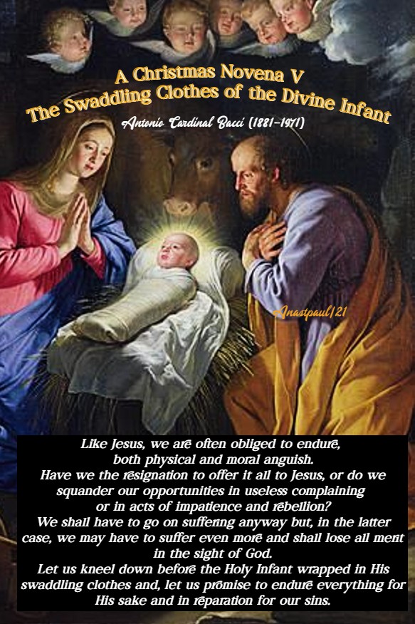 Let us kneel down before the Holy Infant wrapped in His swaddling clothes and, let us promise to endure everything for His sake and in reparation for our sins.”