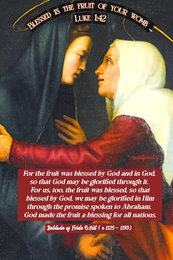 But what is our benefit from this fruit? What other than the fruit of blessing from the blessed fruit? From this seed, this shoot, this flower, surely the fruit of blessing comes forth. It has come even to us; first as a seed it is planted through the grace of pardon, then germinated with the increase of perfection and finally, it flowers in the hope or the attainment of glory. For the fruit was blessed by God and in God, so that God may be glorified through it. For us, too, the fruit was blessed, so that blessed by God, we may be glorified in Him through the promise spoken to Abraham. God made the fruit a blessing for all nations.” – Baldwin of Forde O.Cist ( c 1125– 1190) Cistercian Abbot, Bishop, then Archbishop of Canterbury ( An excerpt from A Sermon on the ‘Hail Mary’).