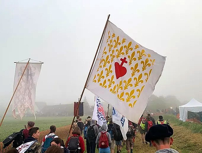 In making the Chartres Pilgrimage, these young people help to give France a new birth of devotion to Mary; something new and spotless has been born as in the warmth of endless glorious Saints – re-lit in the hearts of young moderns. France must now place her hope in youth, the youth of France and the youth of the Church, through Our Blessed Mother, Mary the Lady of Chartres. Although this is primarily a Pentecost Pilgrimage, many smaller groups commence a Pilgrimage on 22 December to be in time for Midnight Mass on Christmas Eve and, in fact, all year round. Below, a French flag displaying the Most Sacred Heart of Jesus with ‘Hope and Salvation of France.’ A Priest hears confession while other Pilgrims participate in Adoration in the background (at the final campsite of the pilgrimage in Gas, France, about 12 miles from Chartres).
