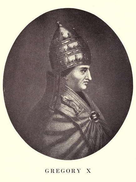 Teobaldo Visconti, a member of the illustrious Visconti family of Piacenza, was born in the City in 1210. In his youth, he was distinguished for his extraordinary virtue and his progress in his studies, especially of the Canon Law, which he began in Italy and pursued at Paris and lastly, at Liege. He was Archdeacon of this last Church, when he received an order from the Pope to preach the Crusade for the recovery of the Holy Land. Incredible were the pains which he took in executing this commission and in reconciling the Christian Princes, who were at variance.