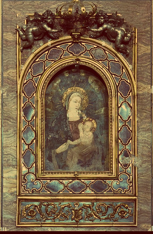 In 1612 the Church reconstruction began and in 1616 the image was re-installed and the Church re-dedicated to the Weeping Madonna. The event is commemorated in a fresco, the Madonna of the Lament, over the high Altar. There is also the painting of the Miracle of the Weeping Madonna opposite the organ on one of the two sides of the Altarpiece. Mother and Child were crowned on 20 May 1643. The ancient image is a representation of Mary nursing the Child.