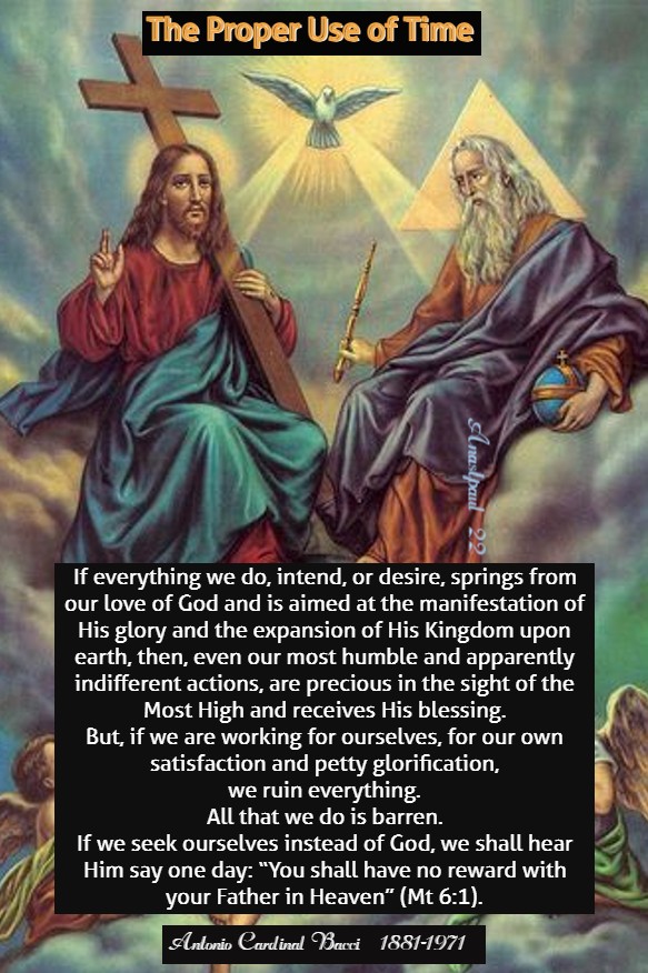 “The high value of the divine gift of time imposes an obligation on us to avoid laziness. The obligation to avoid sin, is still greater. Sin is the most serious way in which we can abuse this gift of God. It is also an act of deep ingratitude, in that, we turn this treasure which God has bestowed on us, into a weapon to be used against the Giver of every good. To use time properly, it is necessary to direct all our actions, intentions and desires towards God, Who is the source of our being and the goal of our earthly pilgrimage.