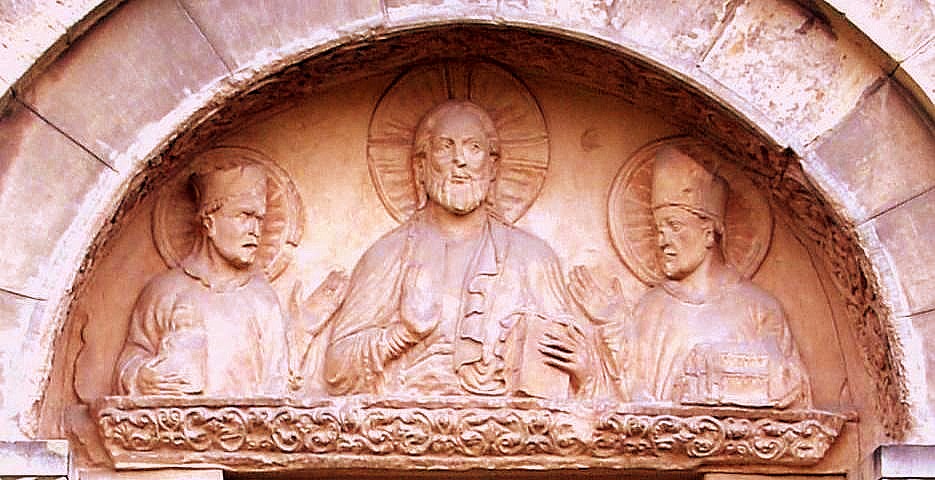 Tympanon depicting Christ, Saint Godehard and Saint Epiphanius, on the StGodehard Basilica in Hildesheim, Germany.