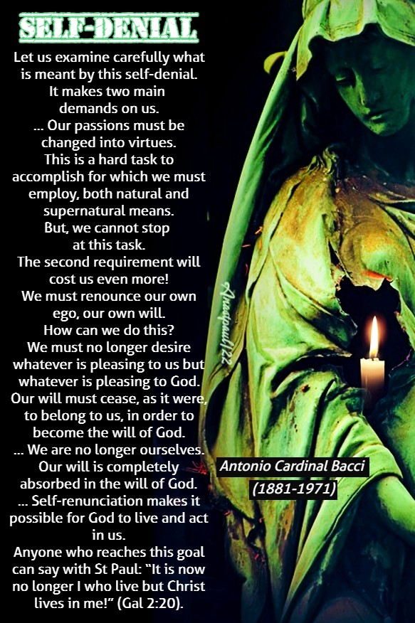 “Let us examine carefully what is meant by this self-denial. It makes two main demands on us. Firstly, we must renounce all those lower impulses and desires, which besiege the soul (1 Peter 2:11). This means, that we have to control and discipline our passions. Since original sin has corrupted our nature, these passions must be restrained and conquered and then, directed towards good objects. Our passions must be changed into virtues. This is a hard task to accomplish for which we must employ, both natural and supernatural means.