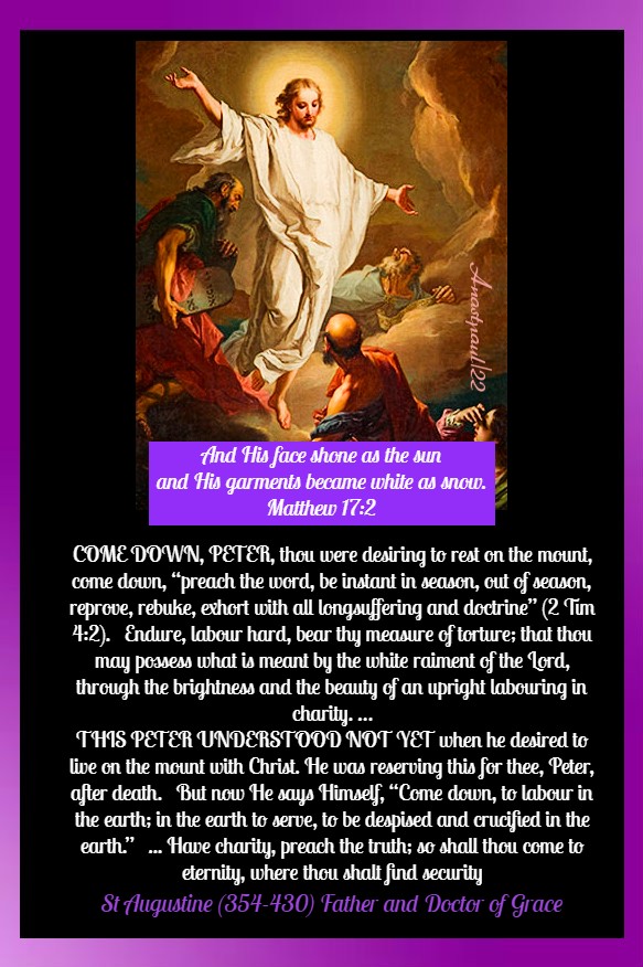 THIS PETER UNDERSTOOD NOT YET when he desired to live on the mount with Christ. He was reserving this for thee, Peter, after death. But now He says Himself, “Come down, to labour in the earth; in the earth to serve, to be despised and crucified in the earth. The Life came down, that He might be slain; the Bread came down, that He might hunger; the Way came down, that Life might be wearied in the Way; the Fountain came down, that He might thirst and dost thou refuse to labour? `Seek not thine own.’ Have charity, preach the truth; so shall thou come to eternity, where thou shalt find security.” – St Augustine (354-430) Bishop of Hippo, Father and Doctor of Grace (Homily on the Transfiguration) (Matthew 17:1-9).