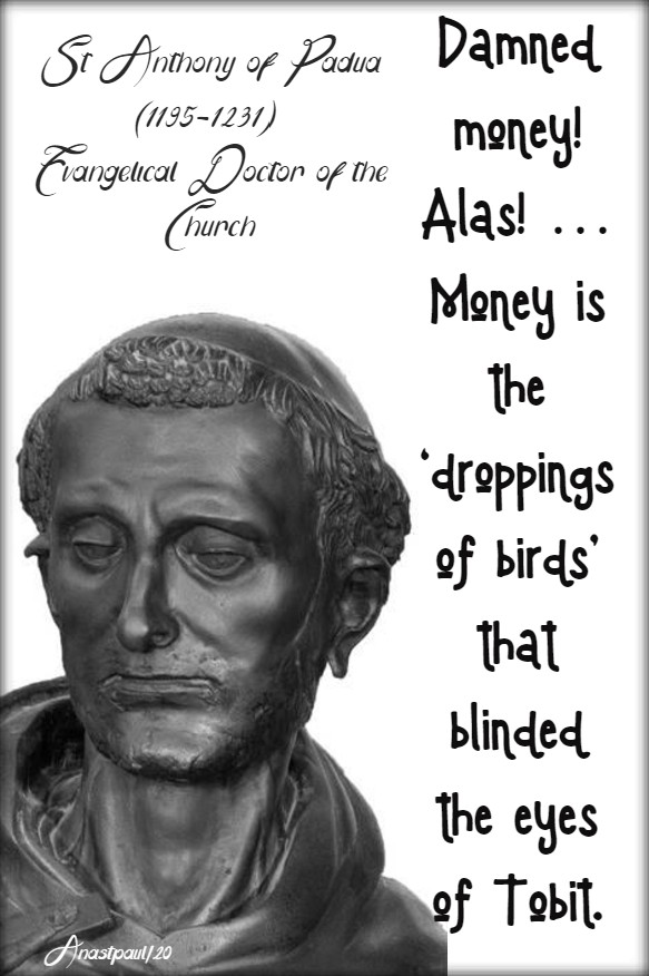 “Damned money! Alas! … Money is the ‘droppings of birds’ that blinded the eyes of Tobit.”